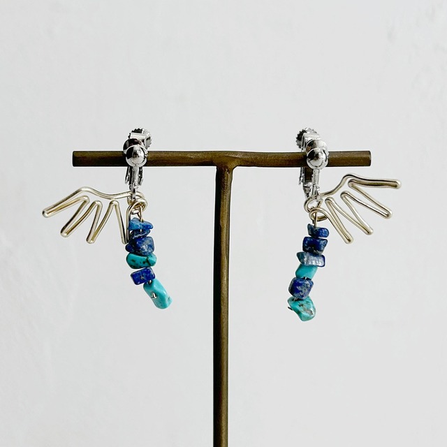 翼をモチーフに、青い石を組み合わせて空をイメージしたイヤリングができました。 涙にも見えます。 *ピアスにも付け替え可能です。 *本体は1つのため、イヤリングorピアスのうち1点購入可能です(イヤリング&ピアスで2点購入はできかねます) ◆素材 本体:アルミ・樹脂/イヤリング部:真鍮 ◆サイズ 画像参照 *ハンドメイドアイテムです。
