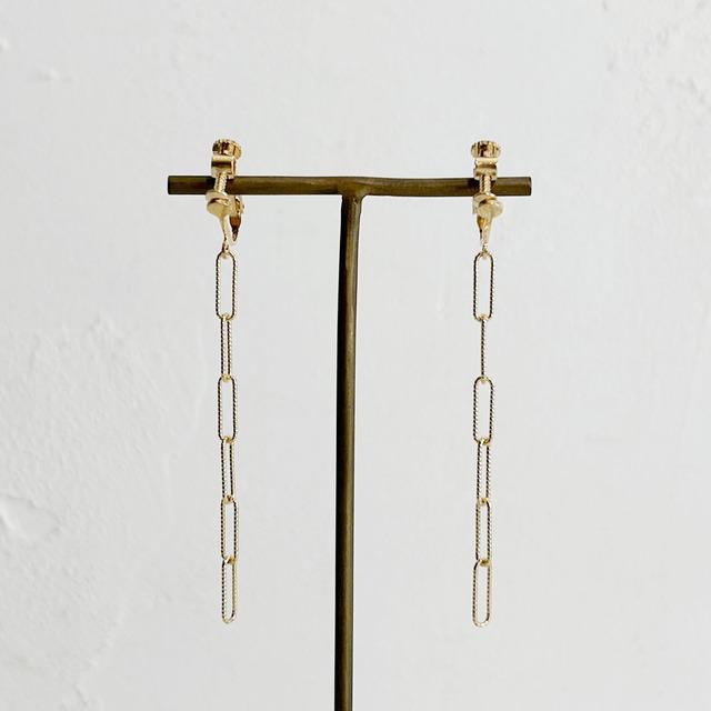 シンプルにチェーンが揺れるイアリングです。 *ピアスにも付け替え可能です。 *本体は1つのため、イヤリングorピアスのうち1点購入可能です(イヤリング&ピアスで2点購入はできかねます) ◆素材 本体:アルミ・銅合金/イヤリング部:真鍮 ◆サイズ 画像参照 *ハンドメイドアイテムです。