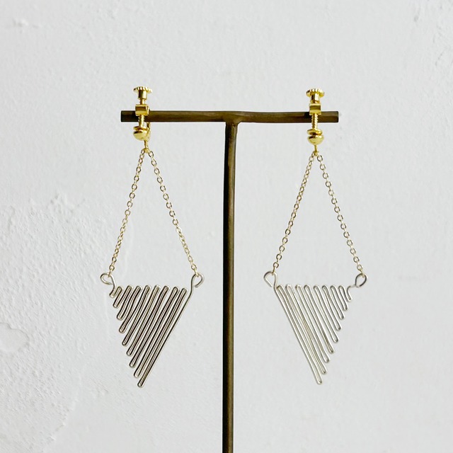 ワイヤーで作られたトライアングルが揺れるイアリングです。 面を線で作っているので、揺れる角度でキラキラと線が際立ちます。 *ピアスにも付け替え可能です。 *本体は1つのため、イヤリングorピアスのうち1点購入可能です(イヤリング&ピアスで2点購入はできかねます) ◆素材 本体:アルミ・銅合金/イヤリング部:真鍮 ◆サイズ 画像参照 *ハンドメイドアイテムです。