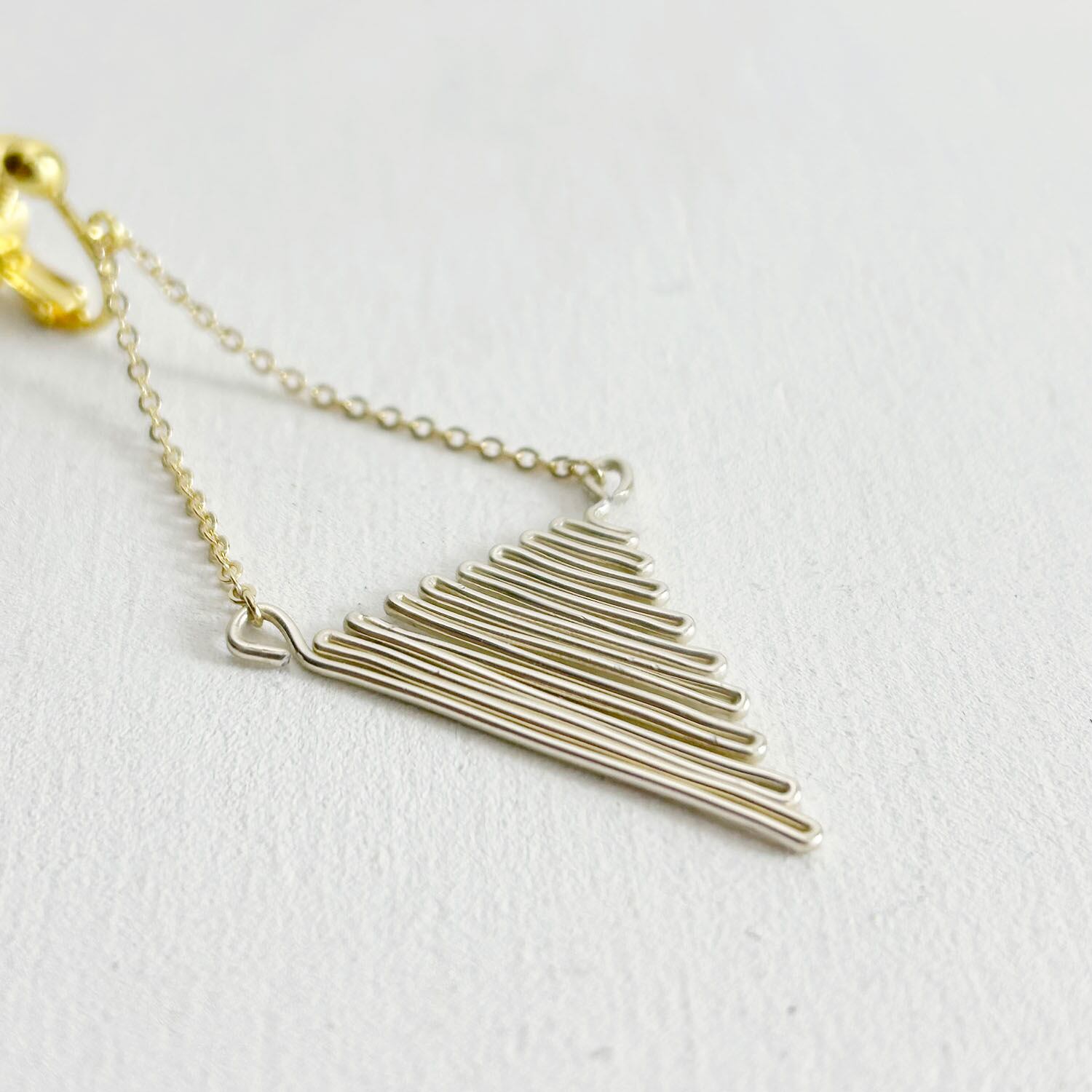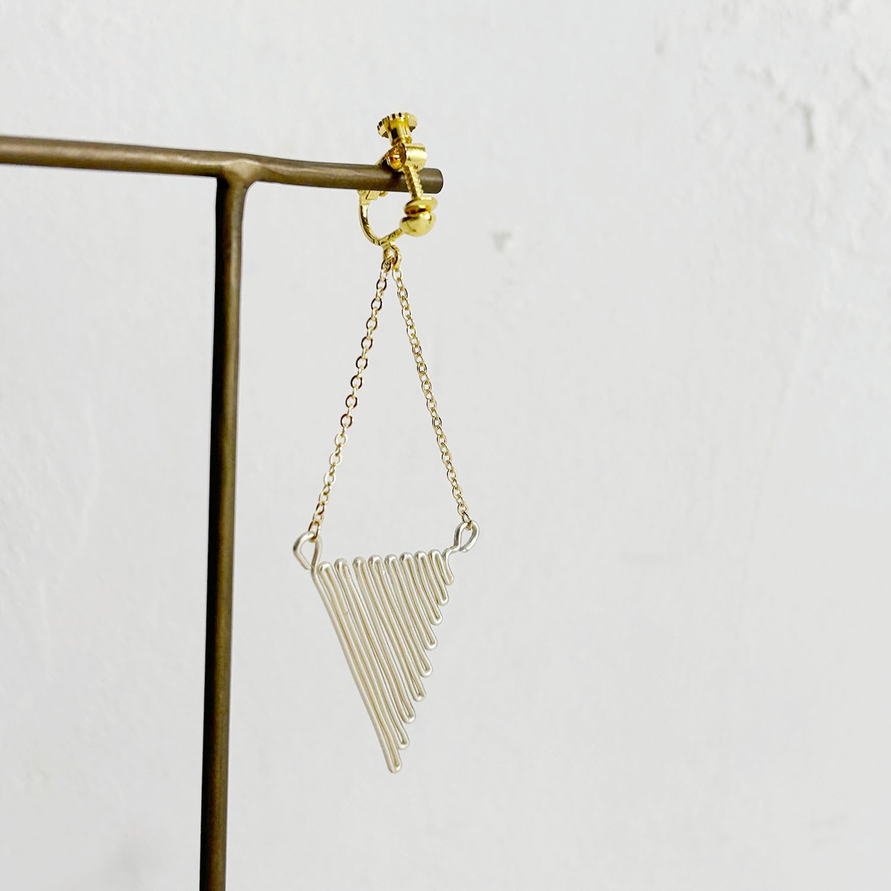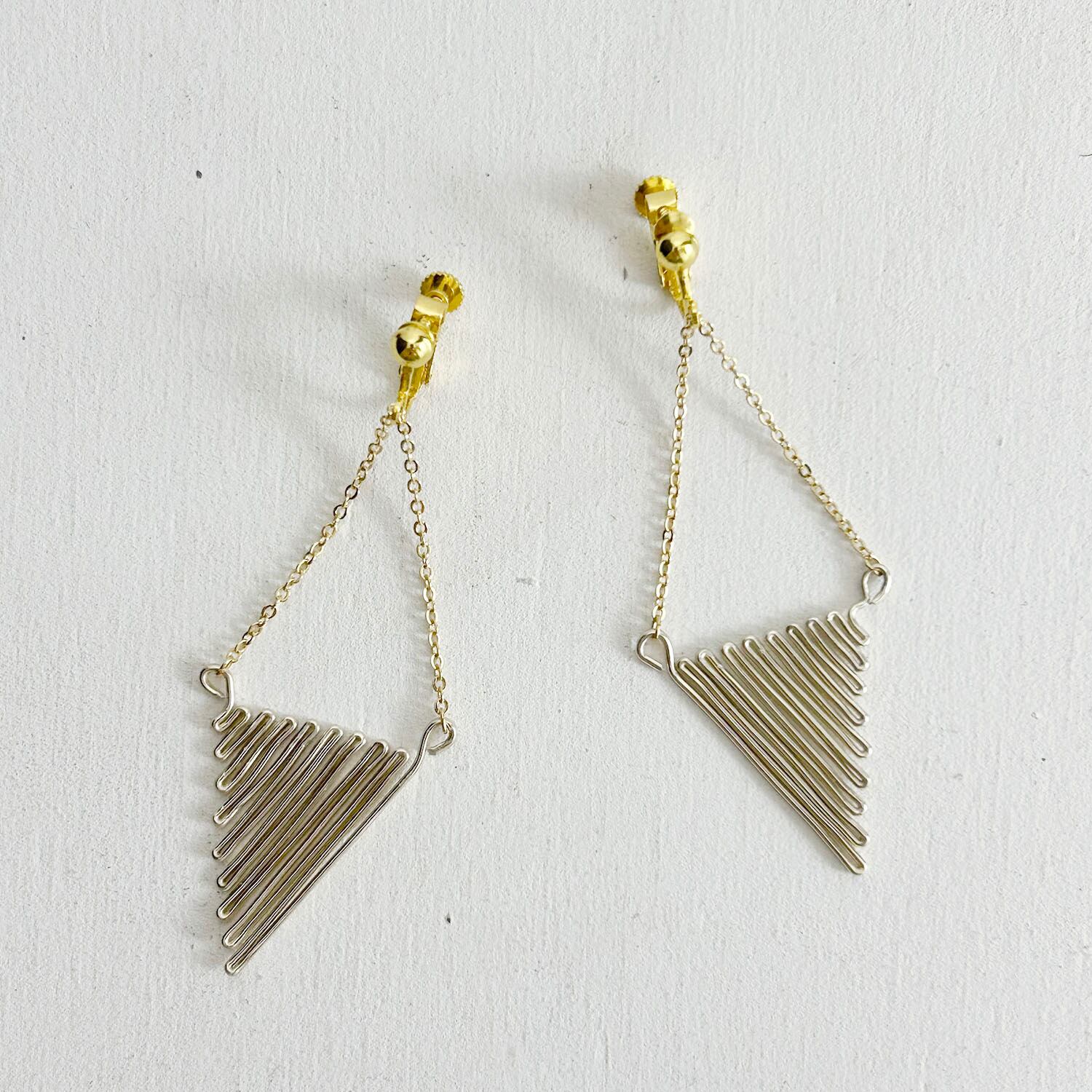 ワイヤーで作られたトライアングルが揺れるイアリングです。