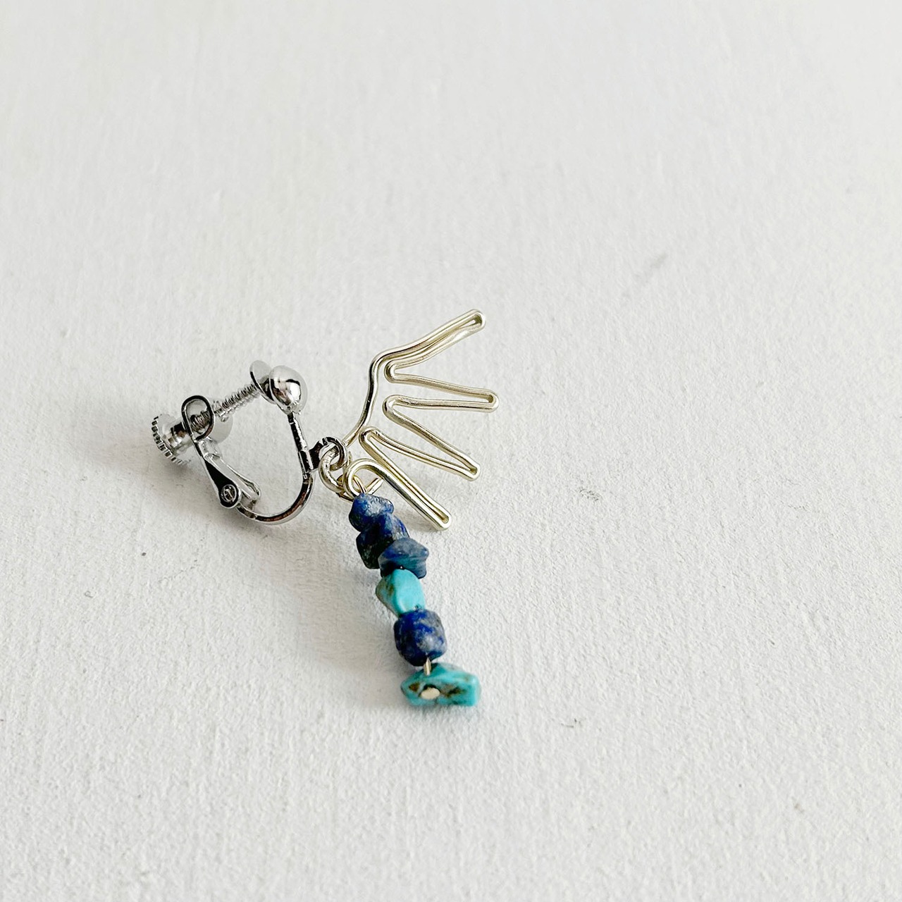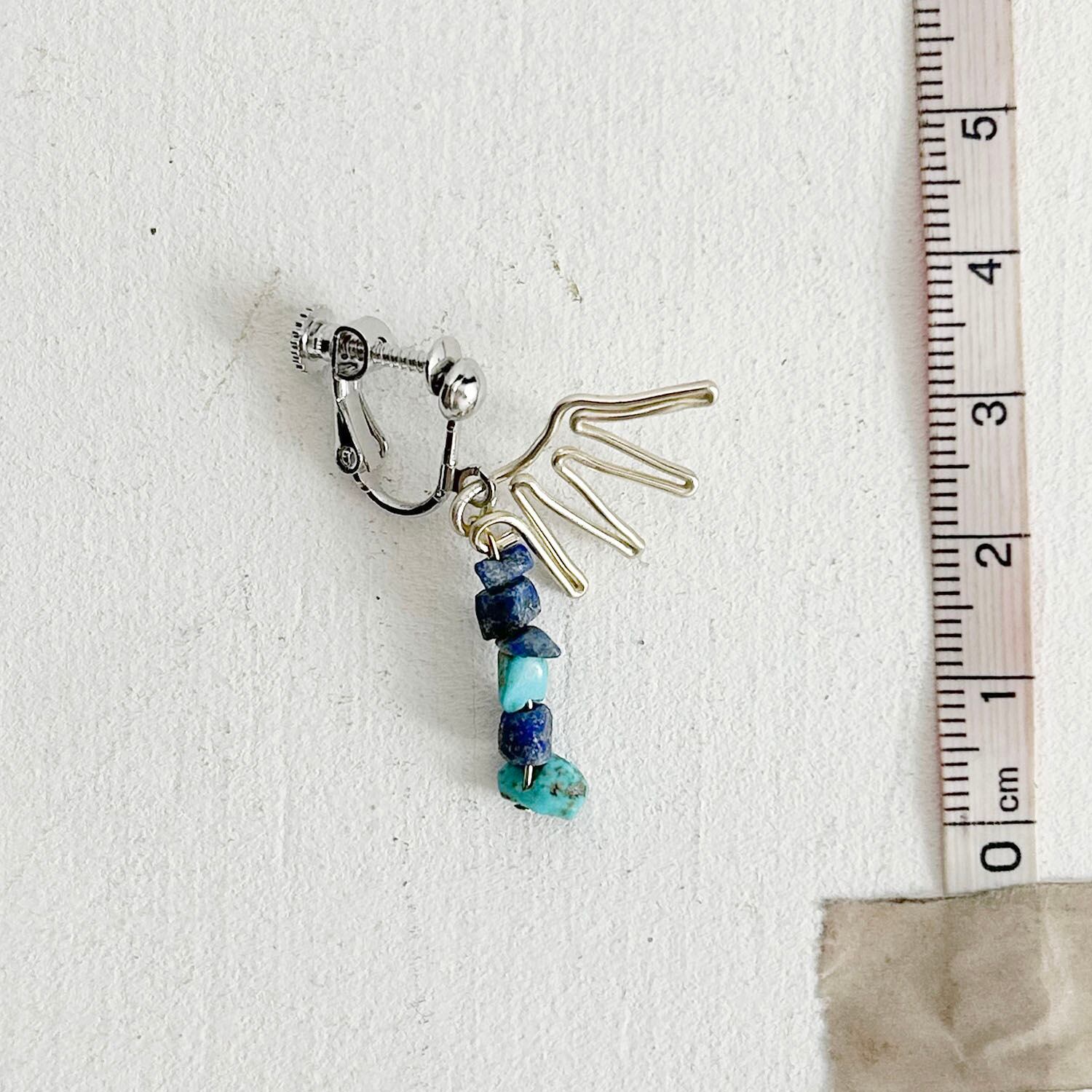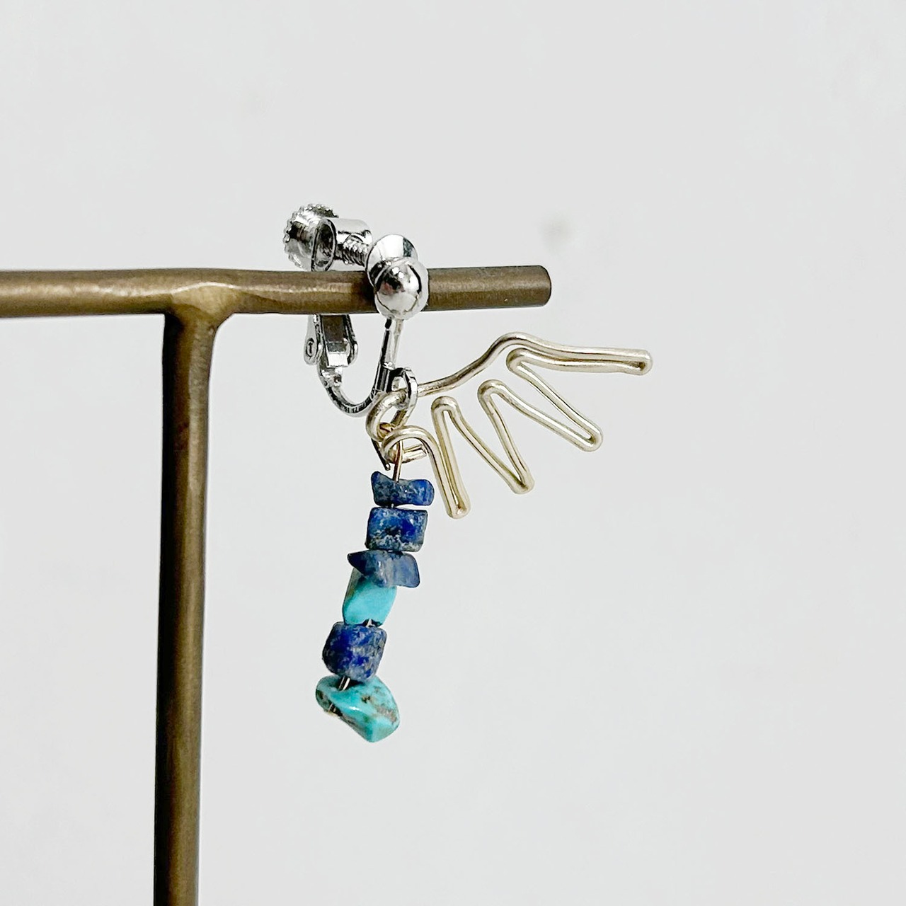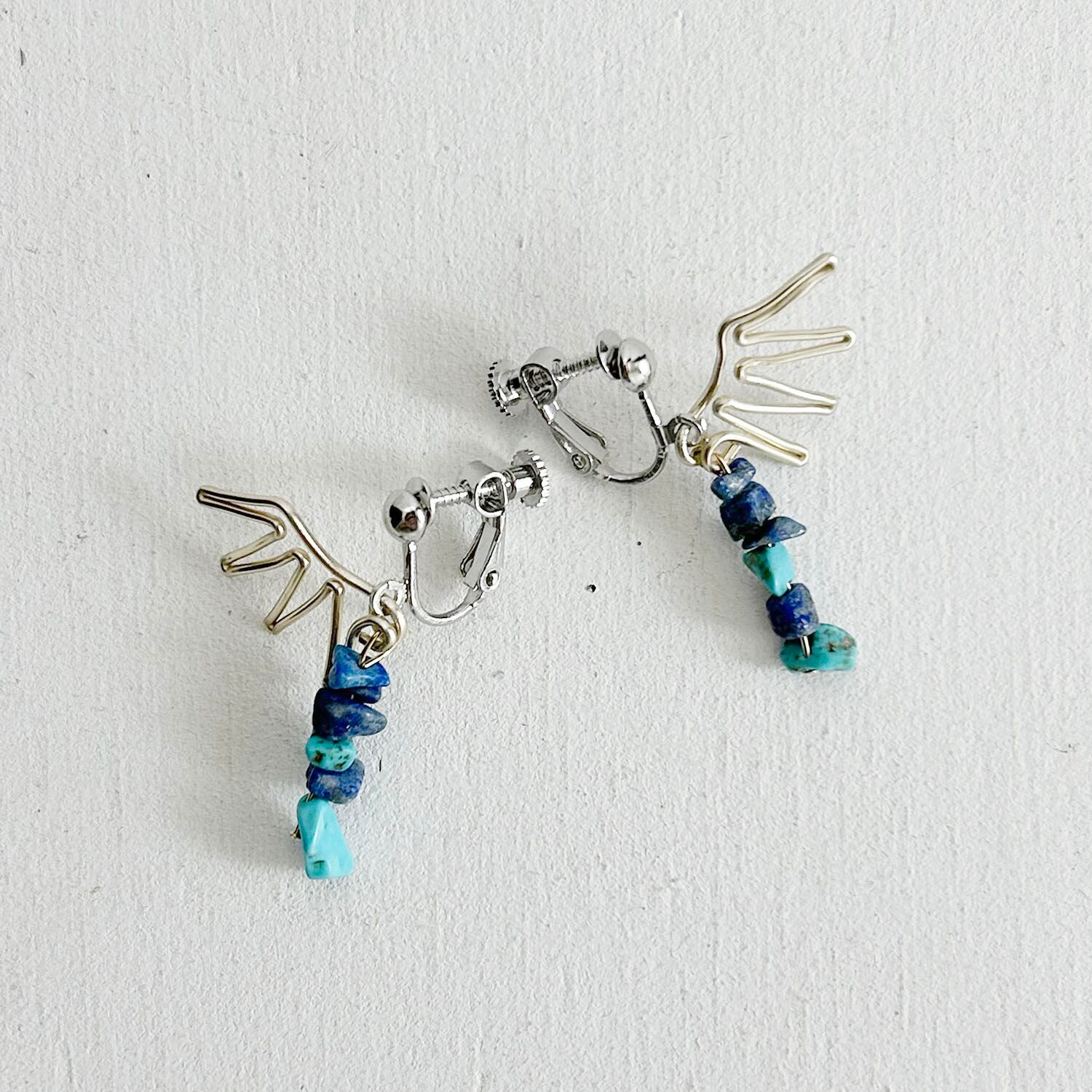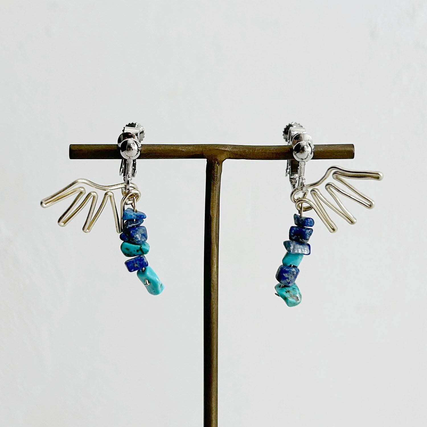 翼をモチーフに、青い石を組み合わせて空をイメージしたイヤリングができました。